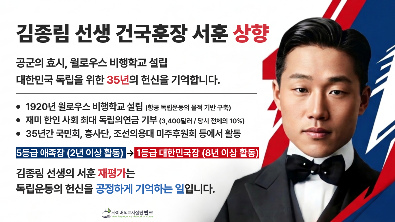 사이버외교사절단 반크(VANK)는 1920년 미국 캘리포니아 윌로우스에서 한인비행사양성소를 설립하고 대한민국 공군의 인적·사상적 기원을 마련한 김종림 선생의 건국훈장 등급을 현행 5등급 애족장에서 상향 조정할 것을 촉구하는 글로벌 캠페인을 전개한다고 밝혔다.유관순·홍범도 선례 바탕으로 독립운동 평가 체계의 형평성 회복 촉구