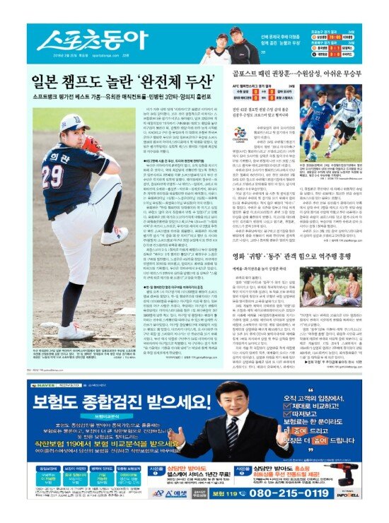 2008년 3월 15일자부터 최근 발행된 스포츠동아 신문 지면을 보실 수 있습니다. (지면 PDF파일 다운로드도 가능)