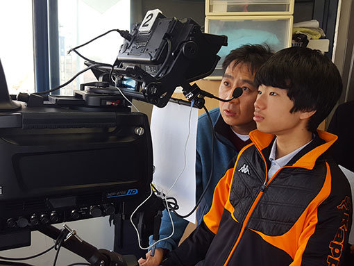하남 신장중학교 방송반 학생(사진 오른쪽)이 11일 미사리 경정장 방송실에서 국민체육진흥공단 경륜경정사업본부 방송팀으로부터 카메라 조작법 설명을 진지하게 듣고 있다. 사진제공 l 국민체육진흥공단