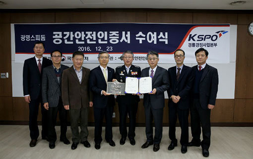 ‘공간안전인증’은 국민안전처가 감독하고 한국안전인증원이 주관하는 국내 유일의 기업 자율안전 평가제도다. ‘안전경영시스템’, ‘소방안전’, ‘건축·방화안전’, ‘위험물안전’, ‘기계·전기·가스안전’, ‘피난·자연재해안전’등 총 6개 분야 238개 항목에서 모두 합격해야 ‘공간안전인증’을 받는다. 광명스피돔은 3만 명을 수용하는 세계최대 규모의 돔 경륜장으로 경륜경정사업본부는 고객의 안전을 위해 ‘공간안전인증’ 획득에 전방위적인 노력을 기울였다. 5월에 실시한 현장심사 결과 지적된 심사위원들의 권고사항에 대해 7개월간 개선작업을 실시해 90%가 넘는 개선효과를 거두며 12월11월 최종 심사에서 공간안전인증 기준을 통과했다.