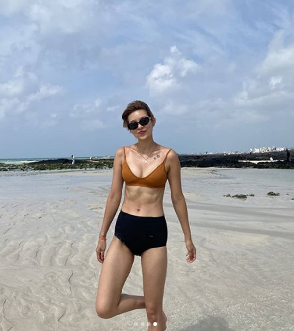 공개된 사진에는 몸매가 강조되는 의상을 입은 송해나 모습이 담겼다. 카라멜색 브라탑과 검은색 하이웨스트 하의를 입은 송해나는 탄탄한 몸매를 뽐냈다. 특히 송해나는 선명한 복근으로 건강한 매력을 자랑했다.