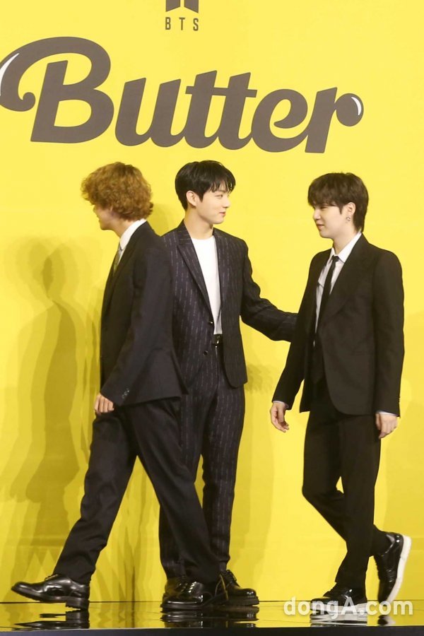 그룹 방탄소년단이 21일 오후 서울 송파구 올림픽공원 올림픽홀에서 열린 디지털 싱글 앨범 \'Butter\' 발매 기념 글로벌 기자간담회에 참석해 포즈를 취하고 있다.
