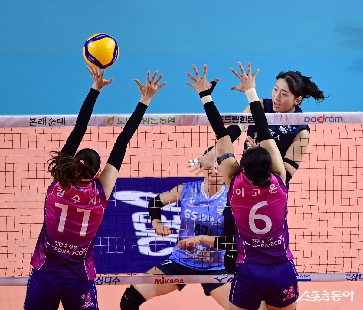 24일 인천삼산월드체육관에서 열린 ‘도드람 2024-2025 V리그’ 여자부 인천 흥국생명과 서울 GS칼텍스의 경기에서 GS칼텍스 권민지가 흥국생명 블로커 앞에서 스파이크를 하고 있다. 인천 | 주현희 기자 teth1147@donga.com