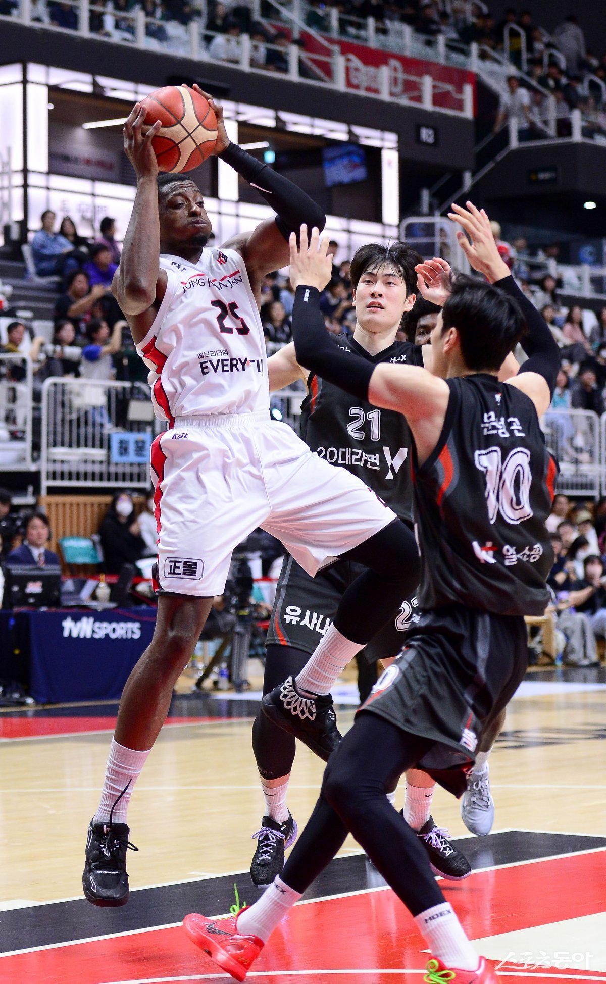 11일 수원kt아레나에서 열린 ‘2024-2025 프로농구’ KT와 정관장 경기에서 정관장 캐디 라렌이 KT의 수비를 뚫고 골밑을 공격하고 있다. 수원|김종원 기자 won@donga.com