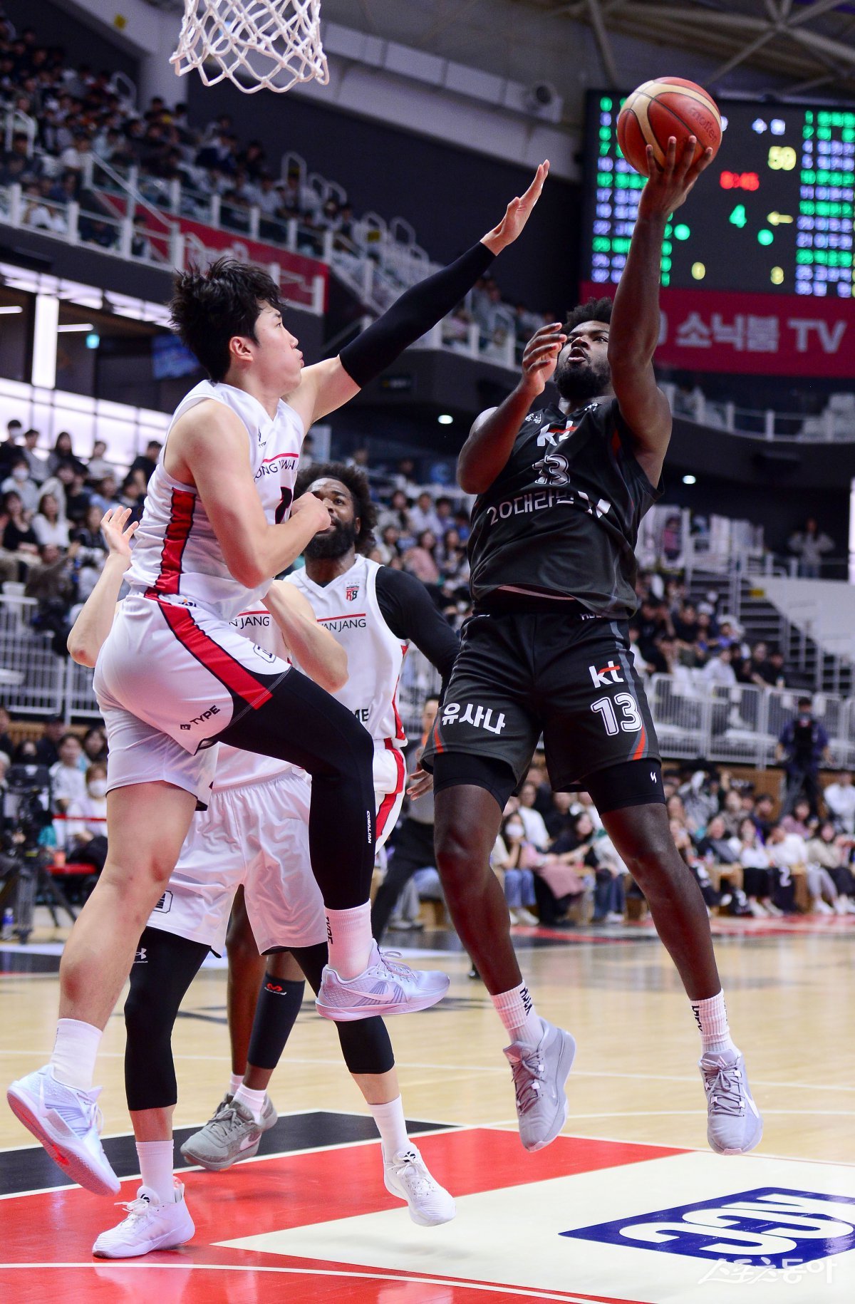11일 수원kt아레나에서 열린 ‘2024-2025 프로농구’ KT와 정관장 경기에서 KT 레이션 해먼즈가 정관장의 수비를 뚫고 골밑 슛을 하고 있다. 수원|김종원 기자 won@donga.com