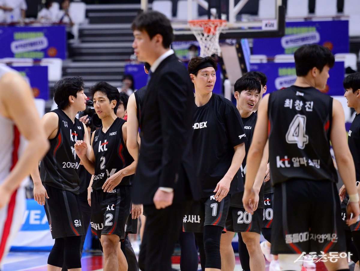 11일 수원kt아레나에서 열린 ‘2024-2025 프로농구’ KT와 정관장 경기에서 69-58 승리를 거두며 2연승을 달린 KT 선수들이 기뻐하고 있다. 수원|김종원 기자 won@donga.com