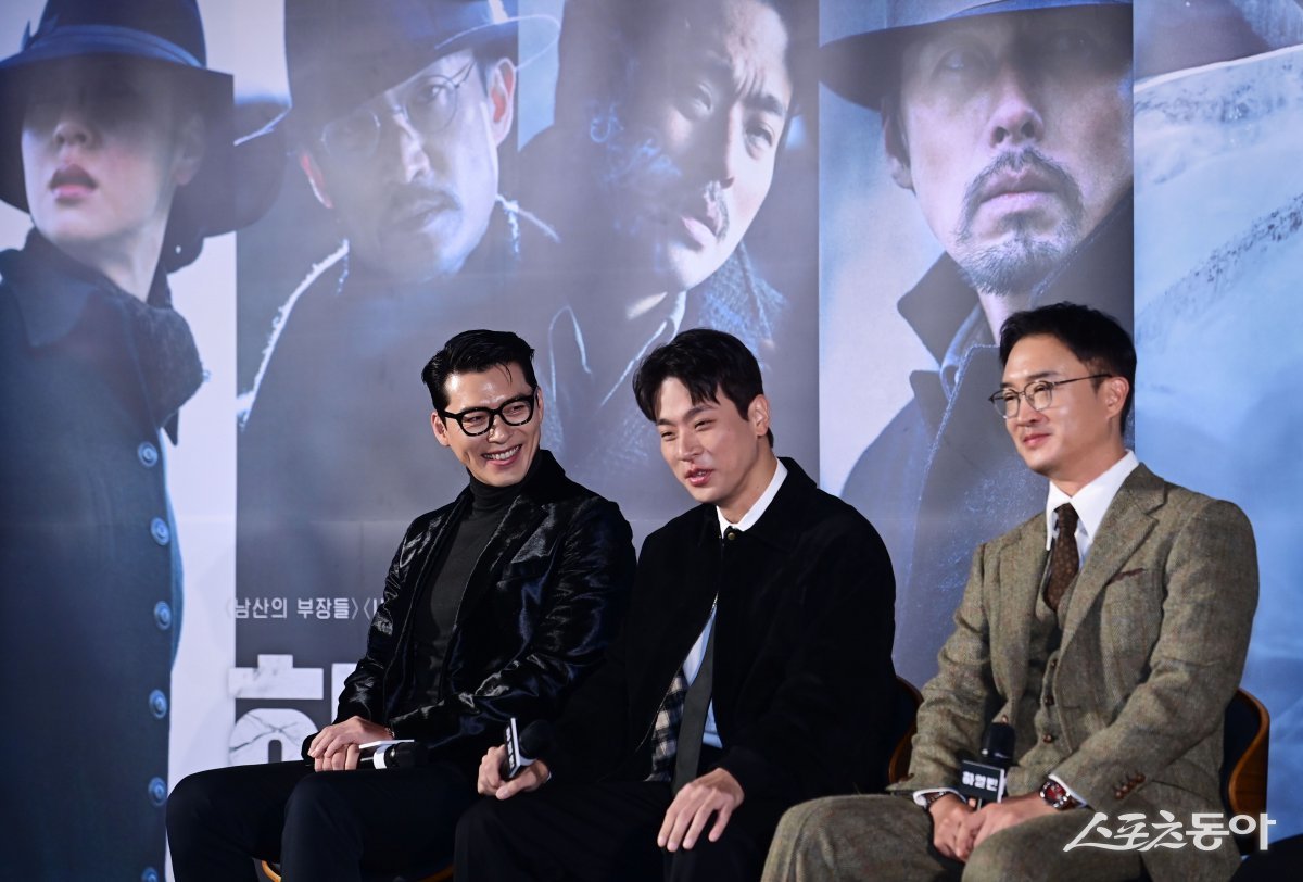 배우 현빈, 박정민, 조우진이 27일 서울 용산구 CGV용산아이파크몰점에서 열린 영화 ‘하얼빈’ 제작보고회에서 동료의 답변에 웃고 있다. 주현희 기자 teth1147@donga.com