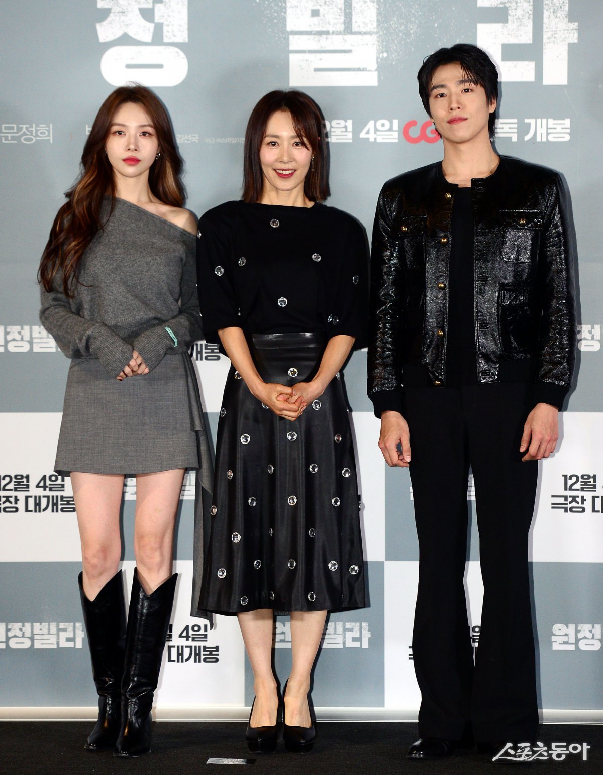 27일 서울 용산구 CGV 용산아이파크몰점에서 열린 영화 ‘원정빌라’ 언론시사회에 참석한 방민아, 문정희, 이현우가 카메라를 향해 포즈를 취하고 있다. 김민성 기자 marineboy@donga.com