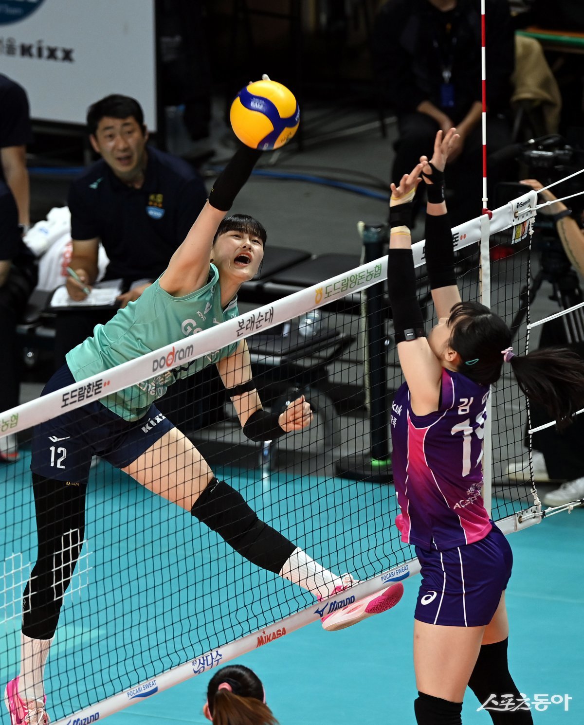 28일 서울 장충체육관에서 ‘도드람 2024-2025 V리그’ 서울 GS칼텍스와 인천 흥국생명의 여자부 경기가 열렸다. GS칼텍스 이주아가 흥국생명 블로커를 피해 스파이크를 날리고 있다. 장충 | 김민성 기자 marineboy@donga.com