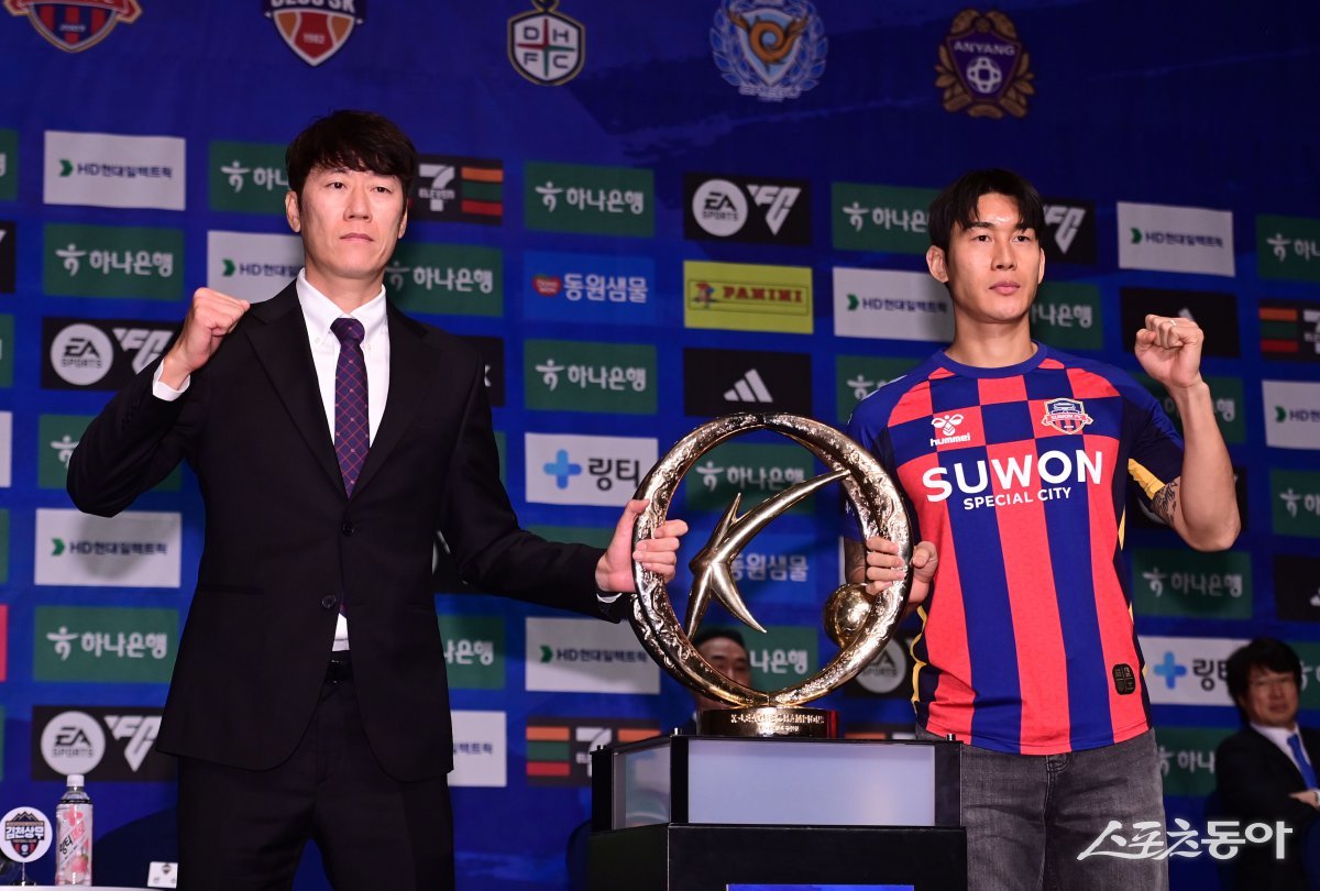 13일 서울 서대문구 홍은동 스위스그랜드호텔에서 열린 ‘K리그 1 2025 개막 미디어데이’에서 수원FC 김은중 감독, 이용이 기념 촬영을 하고 있다. 주현희 기자 teth1147@donga.com
