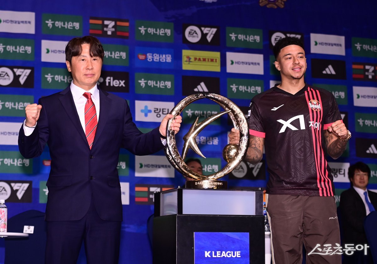 13일 서울 서대문구 홍은동 스위스그랜드호텔에서 열린 ‘K리그 1 2025 개막 미디어데이’에서 FC서울 김기동 감독, 린가드가 기념 촬영을 하고 있다. 주현희 기자 teth1147@donga.com