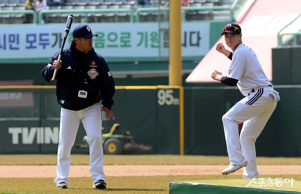 23일 인천 SSG 랜더스필드에서 ‘2025 신한 SOL 뱅크 KBO리그’ SSG 랜더스와 두산 베어스의 경기가 열린다. 경기전 두산 박석민 코치가 박지훈의 타격을 지도하고 있다. 인천 | 김민성 기자 marineboy@donga.com