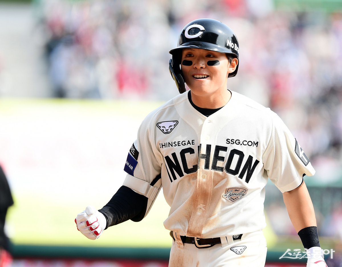 23일 인천 SSG 랜더스필드에서 ‘2025 신한 SOL 뱅크 KBO리그’ SSG 랜더스와 두산 베어스의 경기가 열렸다. 3회말 1사 만루에서 SSG 정준재가 2타점 적시타를 날린 후 환호하고 있다. 인천 | 김민성 기자 marineboy@donga.com