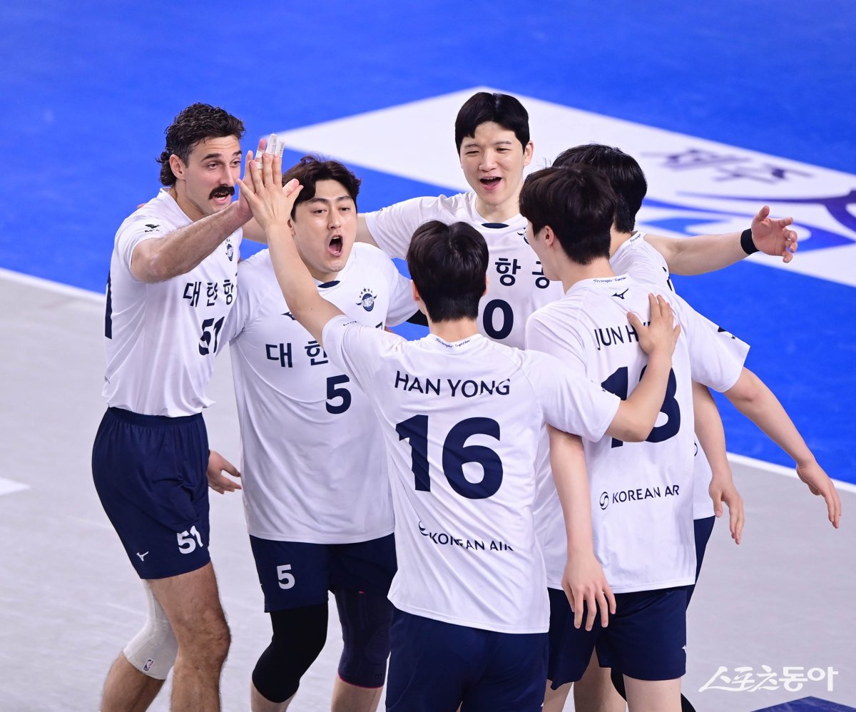 1일 천안종합운동장 유관순체육관에서 열린 ‘2024-2025 V리그 포스트시즌’ 남자부 챔피언결정전 1차전 현대캐피탈과 대한항공의 경기에서 팀 득점에 성공한 대한항공 선수들이 기쁨을 나누고 있다. 천안 | 주현희 기자 teth1147@donga.com