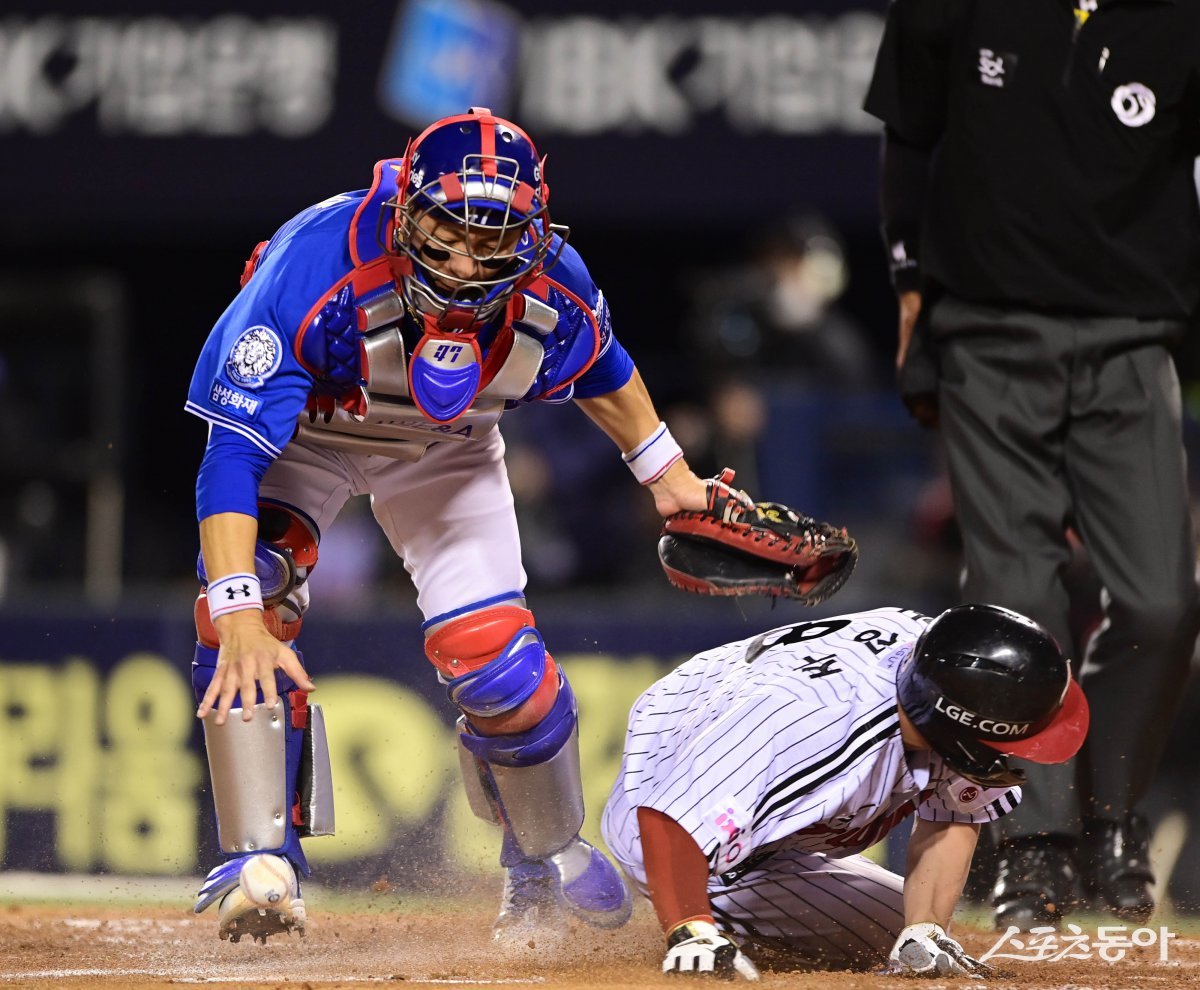 16일 서울 잠실야구장에서 열린 ‘2025 신한 SOL Bank KBO리그’ 삼성 라이온즈와 LG 트윈스의 경기에서 4회말 1사 2, 3루 LG 신민재의 내야 땅볼 때 삼성 강민호가 3루주자 문성주와 충돌하며 실점하고 있다. 잠실 | 주현희 기자 teth1147@donga.com