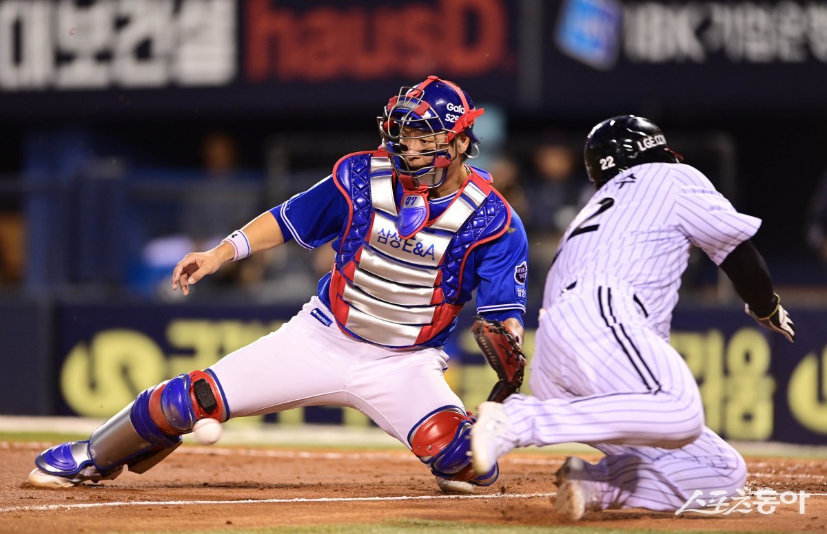 16일 서울 잠실야구장에서 열린 ‘2025 신한 SOL Bank KBO리그’ 삼성 라이온즈와 LG 트윈스의 경기에서 3회말 2사 1, 2루 LG 문보경이 안타 때 삼성 강민호가 2루주자 김현수에게 역전을 허용하고 있다. 잠실 | 주현희 기자 teth1147@donga.com
