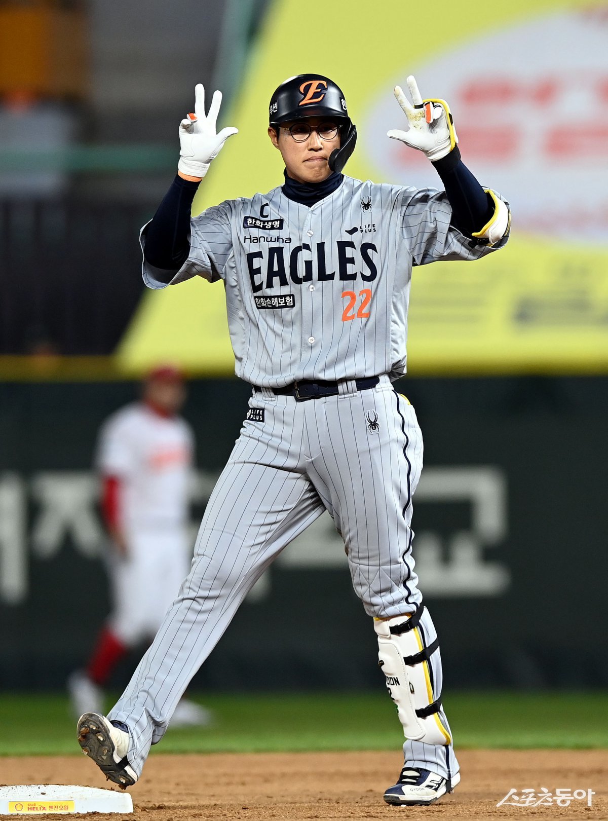 16일 인천 SSG 랜더스필드에서 ‘2025 신한 SOL 뱅크 KBO리그’ SSG 랜더스와 한화 이글스의 경기가 열렸다. 7회초 2사 2루에서 한화 채은성이 1타점 2루타를 날린 후 세리머니를 펼치고 있다. 인천 | 김민성 기자 marineboy@donga.com