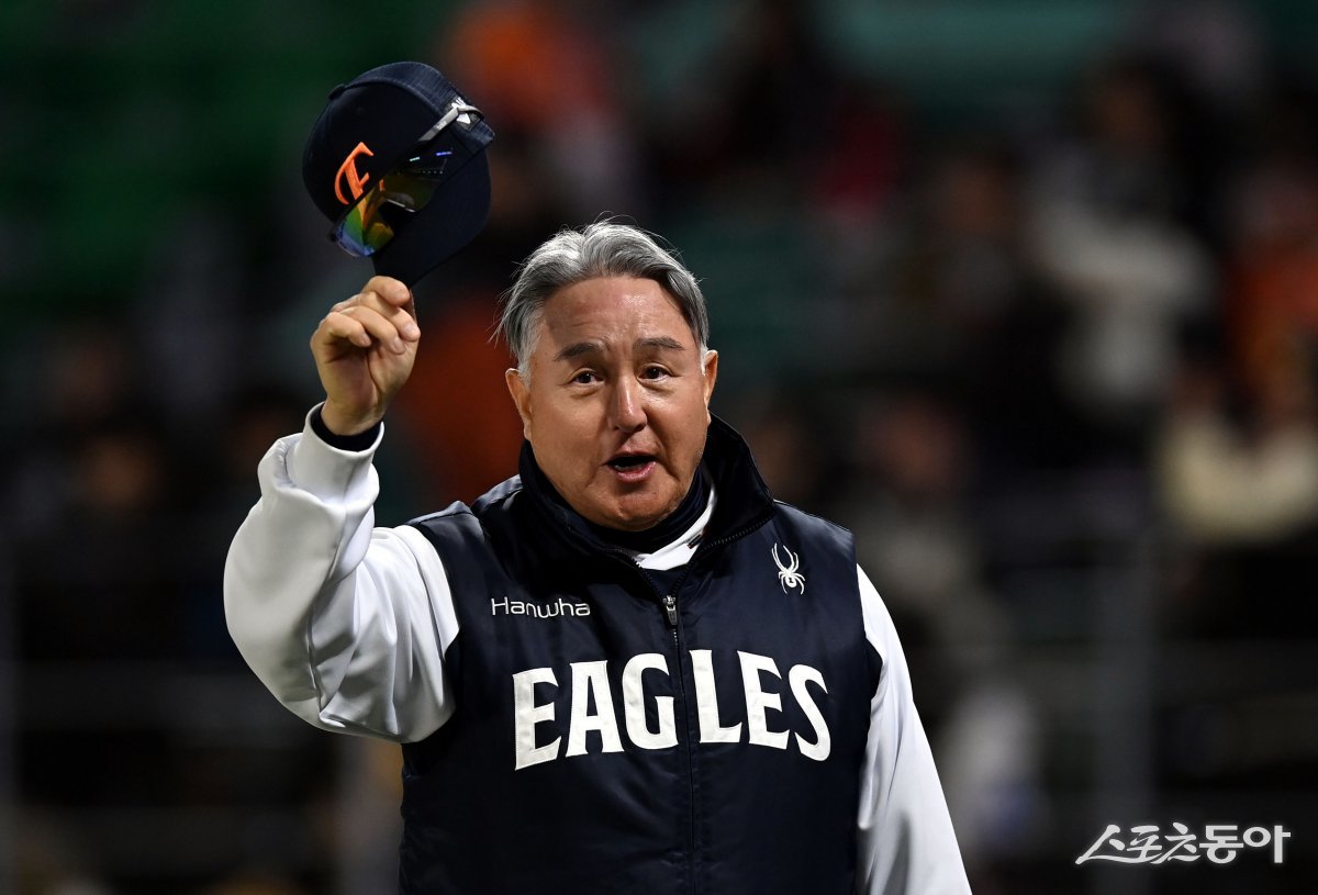 16일 인천 SSG 랜더스필드에서 ‘2025 신한 SOL 뱅크 KBO리그’ SSG 랜더스와 한화 이글스의 경기가 열렸다. 한화가 SSG를 상대로 10-4로 승리한 후 김경문 감독이 팬들에게 인사하고 있다. 인천 | 김민성 기자 marineboy@donga.com