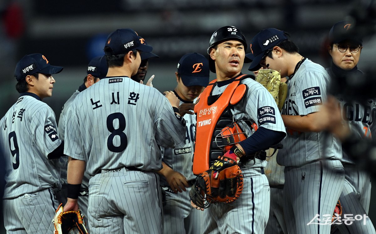 17일 인천 SSG 랜더스필드에서 ‘2025 신한 SOL 뱅크 KBO리그’ SSG 랜더스와 한화 이글스의 경기가 열렸다. 한화가 SSG를 상대로 4-2 승리 후 선수들이 그라운드에서 기쁨을 나누고 있다. 인천 | 김민성 기자 marineboy@donga.com