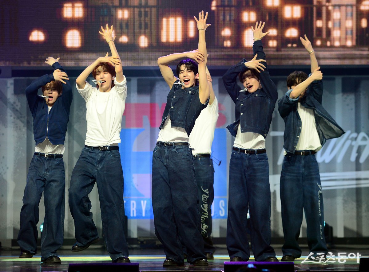 21일 서울 용산구 블루스퀘어에서 TWS(투어스)가 미니 3집 ‘트라이 위드 어스’(TRY WITH US)를 발매하고 미디어쇼케이스를 가졌다. 투어스가 타이틀곡 ‘마음 따라 뛰는 건 멋지지 않아?’ 공연을 펼치고 있다. 김민성 기자 marineboy@donga.com