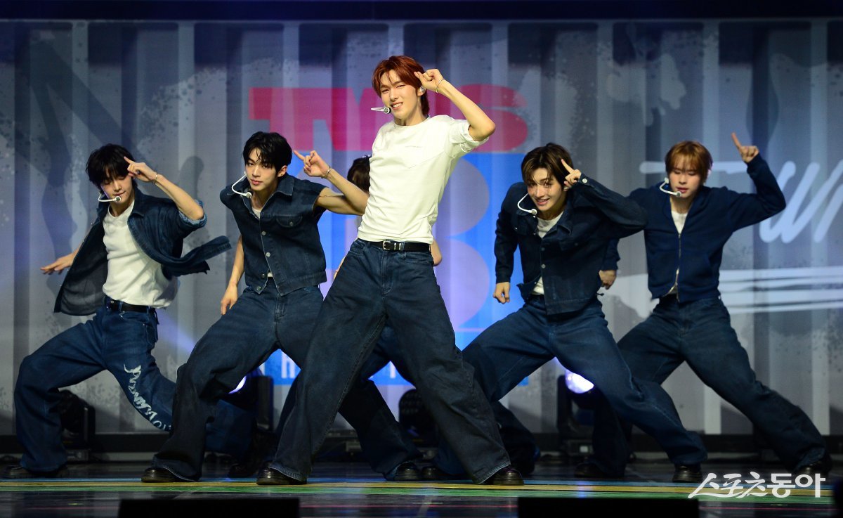 21일 서울 용산구 블루스퀘어에서 TWS(투어스)가 미니 3집 ‘트라이 위드 어스’(TRY WITH US)를 발매하고 미디어쇼케이스를 가졌다. 투어스가 타이틀곡 ‘마음 따라 뛰는 건 멋지지 않아?’ 공연을 펼치고 있다. 김민성 기자 marineboy@donga.com