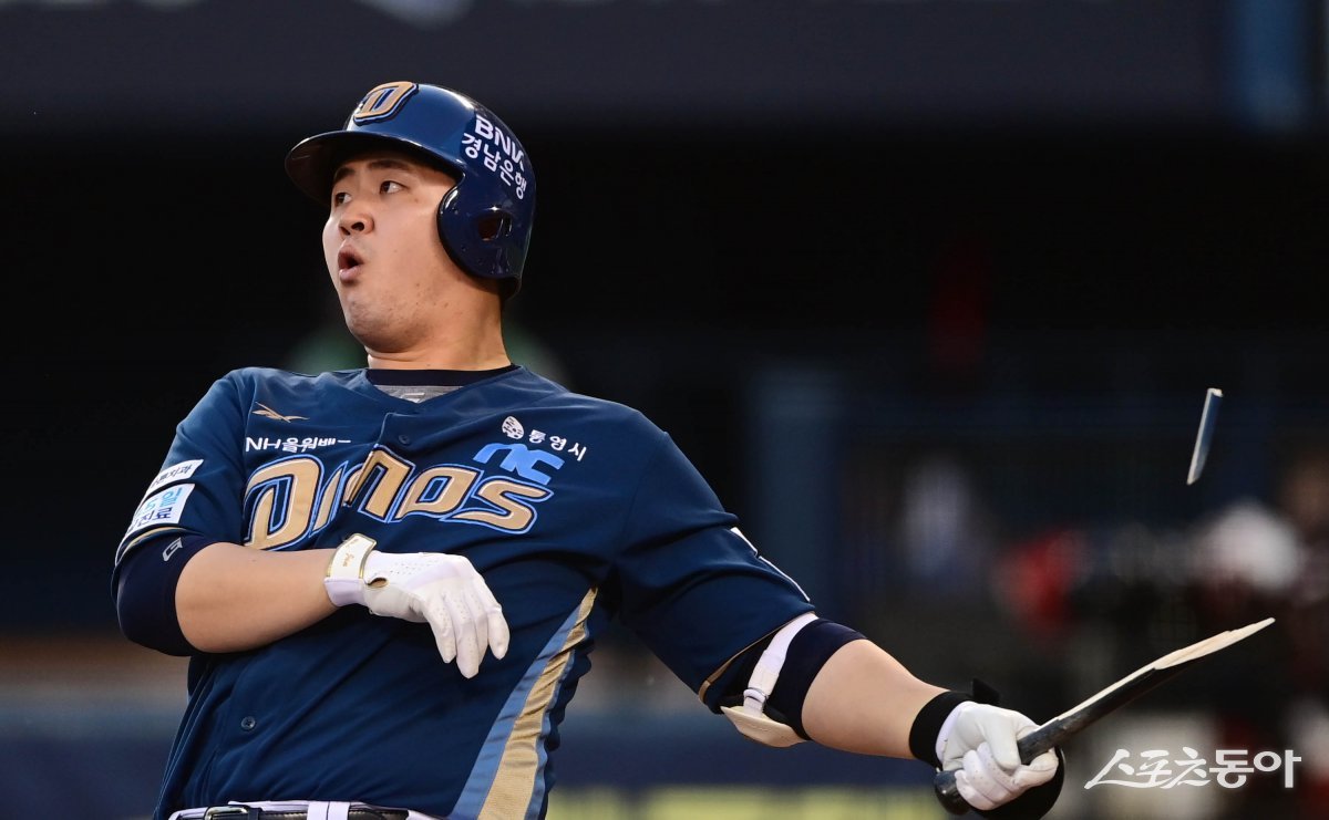 24일 서울 잠실야구장에서 열린 ‘2025 신한 SOL Bank KBO리그’ NC 다이노스와 LG 트윈스의 경기에서 2회초 2사 NC 김형준이 타격 과정에서 부러진 배트에 놀라고 있다. 잠실 | 주현희 기자 teth1147@donga.com