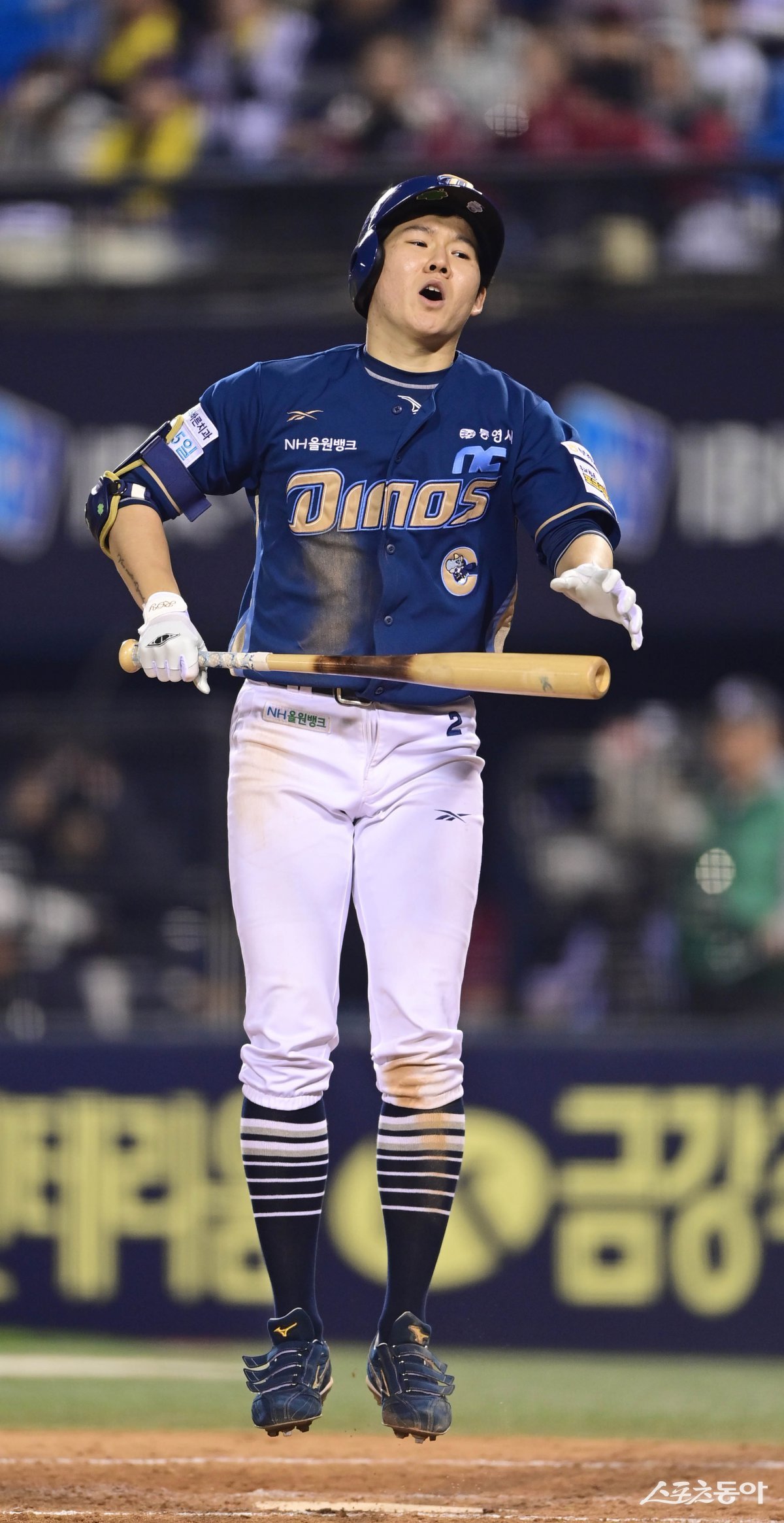24일 서울 잠실야구장에서 열린 ‘2025 신한 SOL Bank KBO리그’ NC 다이노스와 LG 트윈스의 경기에서 7회초 2사 만루 NC 박민우가 삼진 아웃을 당한 후 아쉬워하고 있다. 잠실 | 주현희 기자 teth1147@donga.com