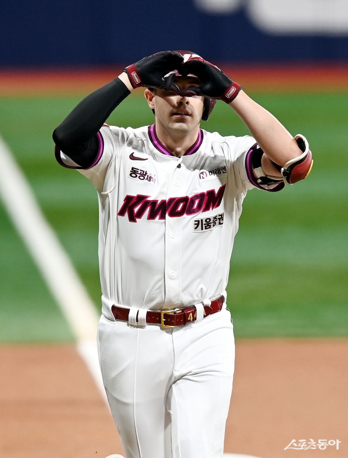 29일 서울 고척스카이돔에서 ‘2025 신한 SOL 뱅크 KBO리그’ 키움 히어로즈와 롯데 자이언츠의 경기가 열렸다. 1회말 2사에서 키움 카디네스가 솔로 홈런을 쏘아올린 후 세리머니를 펼치고 있다. 고척 | 김민성 기자 marineboy@donga.com