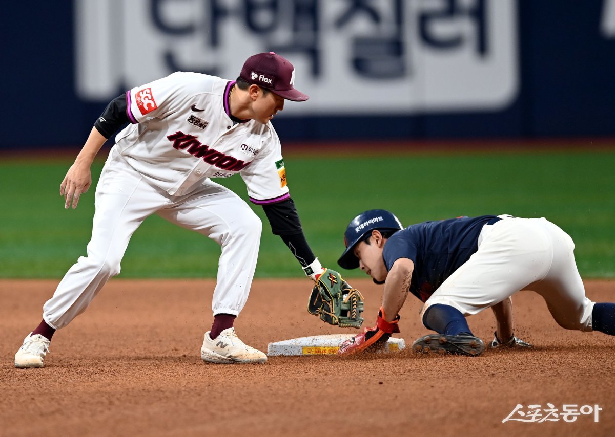 29일 서울 고척스카이돔에서 ‘2025 신한 SOL 뱅크 KBO리그’ 키움 히어로즈와 롯데 자이언츠의 경기가 열렸다. 5회초 2사 1루에서 롯데 황성빈이 2루 도루를 성공하고 있다. 고척 | 김민성 기자 marineboy@donga.com