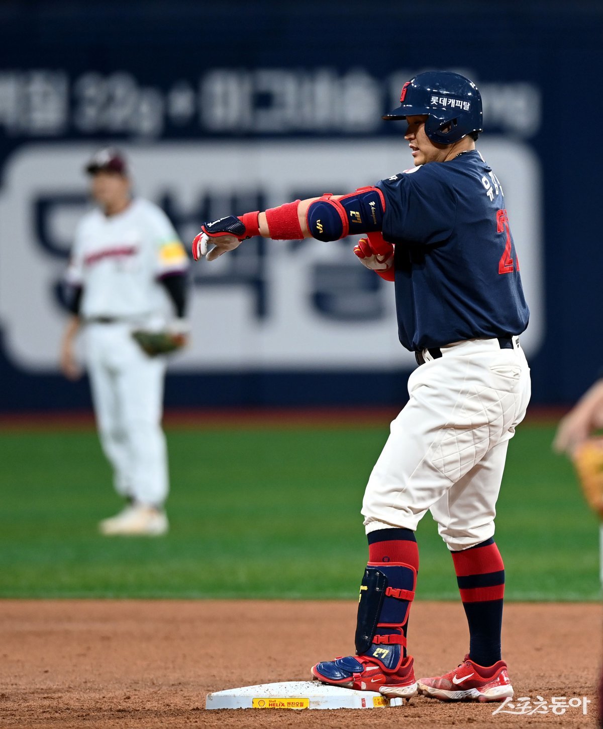 29일 서울 고척스카이돔에서 ‘2025 신한 SOL 뱅크 KBO리그’ 키움 히어로즈와 롯데 자이언츠의 경기가 열렸다. 2회초 1사 2, 3루에서 롯데 유강남이 2타점 2루타를 날린 후 환호하고 있다. 고척 | 김민성 기자 marineboy@donga.com