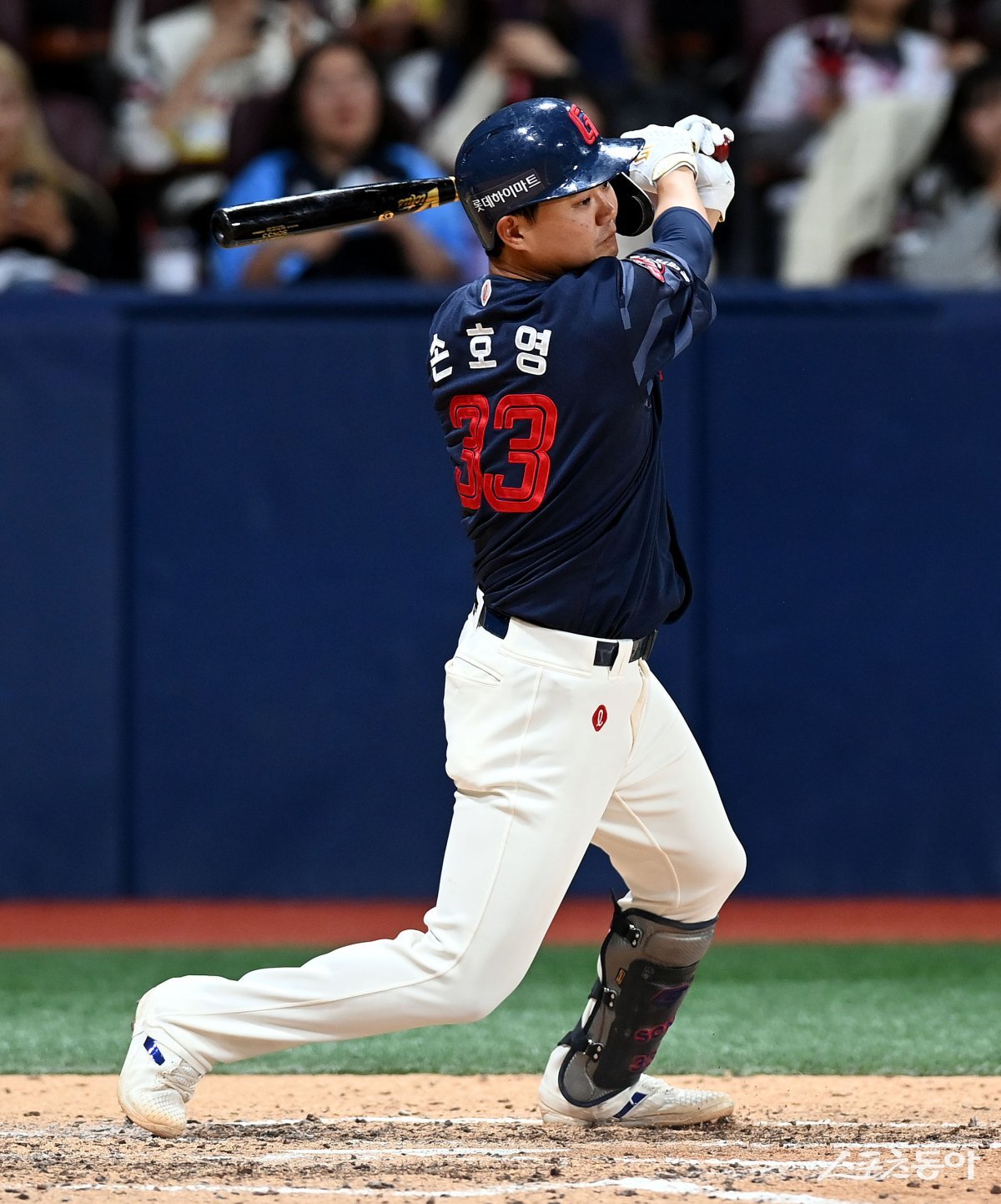 29일 서울 고척스카이돔에서 ‘2025 신한 SOL 뱅크 KBO리그’ 키움 히어로즈와 롯데 자이언츠의 경기가 열렸다. 7회초 1사 2, 3루에서 롯데 손호영이 2타점 적시타를 날리고 있다. 고척 | 김민성 기자 marineboy@donga.com