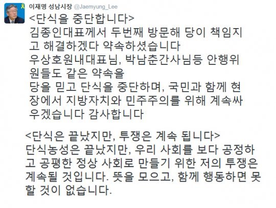 이날 이 시장은 자신의 트위터를 통해 “단식을 중단한다”며 “김종인 대표께서 두번째 방문해 당이 책임지고 해결하겠다 약속하셨다”고 전했다.