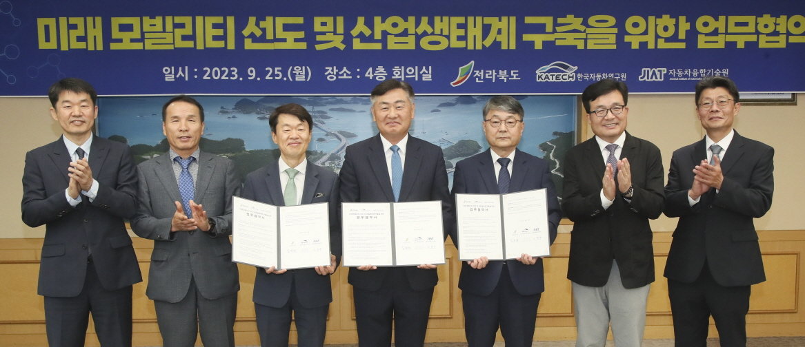전라북도가 지난 25일 도청 회의실에서 미래 모빌리티산업 선도, 관련 산업 생태계 구축 등 고도화를 위해 한국자동차연구원, 자동차융합기술원과 업무협약을 체결했다. 사진제공ㅣ전북도