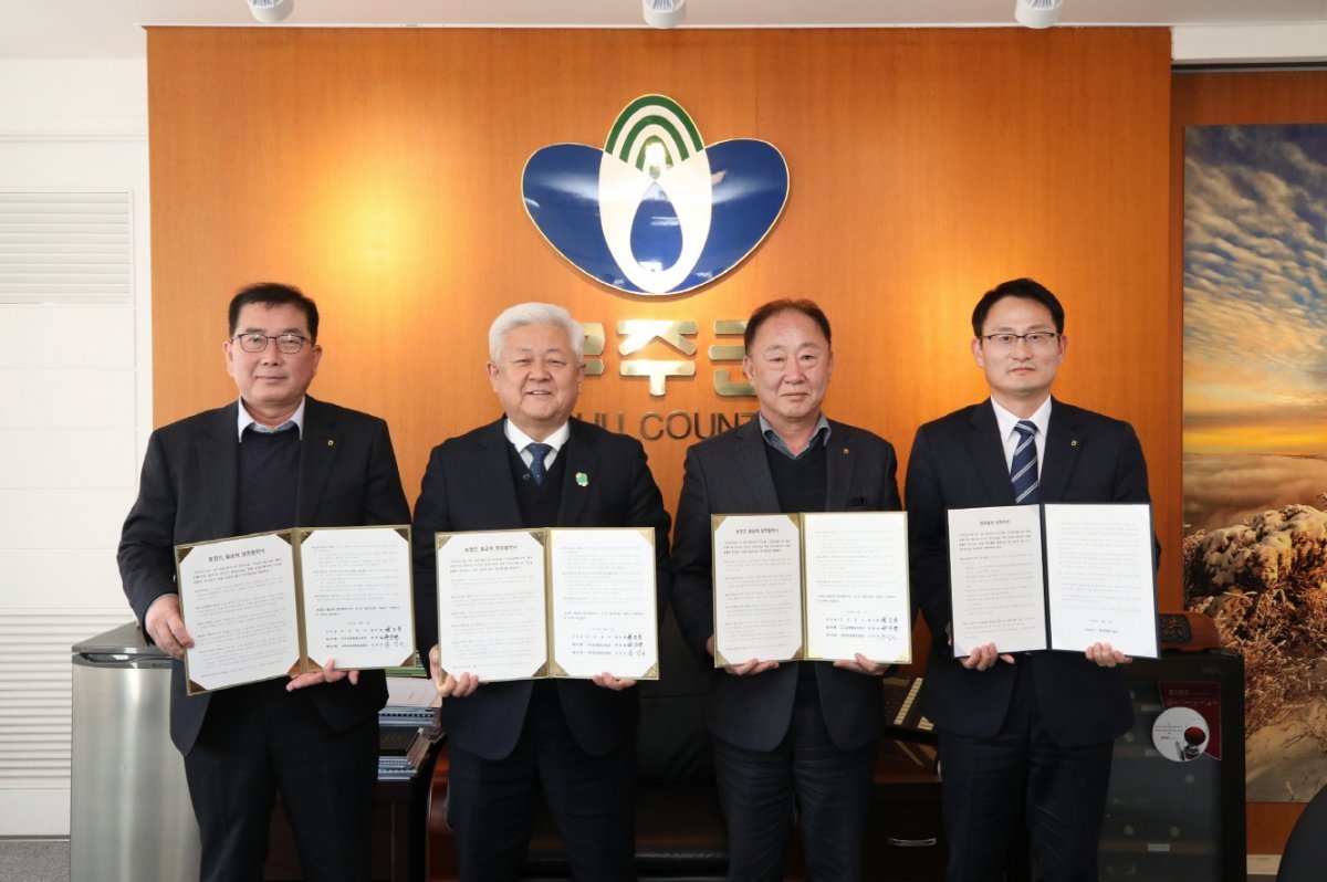 무주군이 지난 13일 농업인 월급제의 원활한 시행을 위해 무주농협, 구천동농협과 업무협약을 체결했다. 사진제공ㅣ무주군