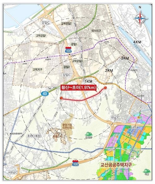 경기주택도시공사(GH)는 지난 28일 하남교산 신도시 광역교통개선대책으로 추진하는 황산~초이간 도로 개설사업이 하남시 도시계획심의를 완료했다.
