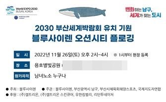 부산 남구가 오는 26일 오후 2시 용호별빛공원에서 해양복원단체 블루사이렌과 2030부산세계박람회 유치기원 오션시티 플로깅 행사를 개최한다고 밝혔다. 2030부산세계박람회 지지 서명·참가자 단체 응원 예정