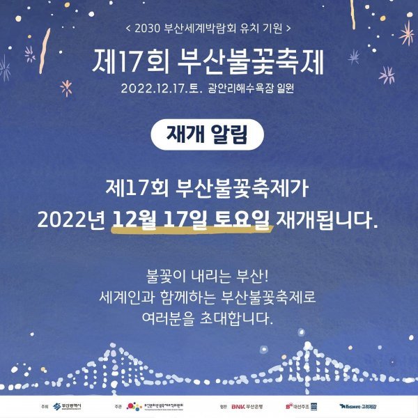 10.29 사고로 연기됐던 부산불꽃축제가 광안리해수욕장 등 부산의 겨울 밤하늘을 불꽃으로 수놓는다.광안리해수욕장·동백섬·이기대 앞 연출