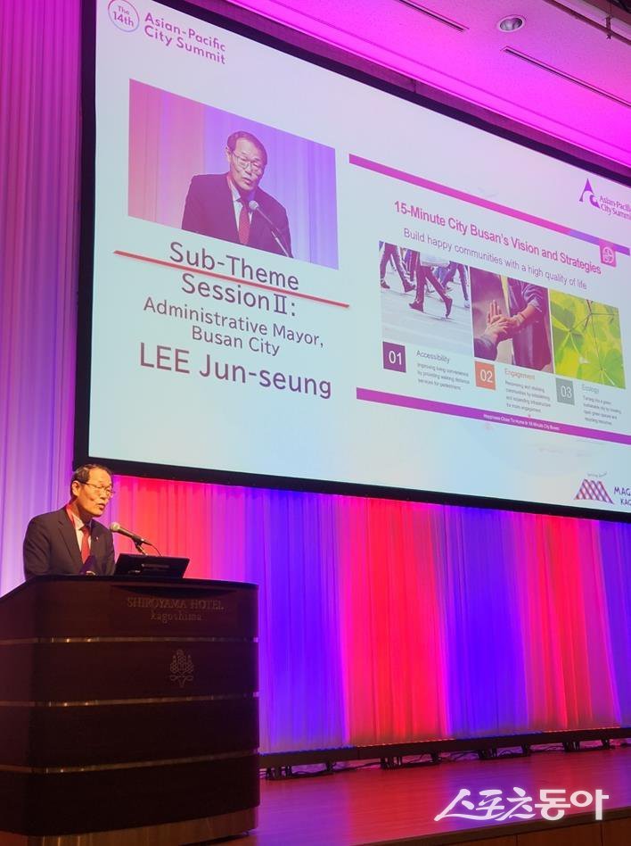 부산시가 지난 22~24일 가고시마에서 열린 ‘제14회 아시아태평양도시서미트(APCS)’에 참석한 가운데 이준승 행정부시장이 부산의 15분 도시정책을 소개하고 있다. (사진제공=부산시)