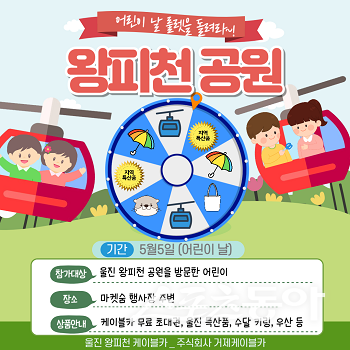 왕피천 케이블카는 먹거리장터 광장에서 어린이날 당일 11시부터 15시 30분까지 룰렛 추첨 이벤트를 실시해 울진 특산품, 우산, 에코백 등 다양한 선물을 제공한다.