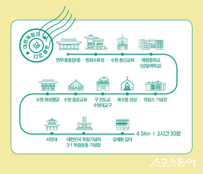 총 4.5km 구간을 도보로 이동하며, 약 3시간이면 수원지역 독립운동의 주요 무대와 인물들의 숨결을 되새길 수 있다.