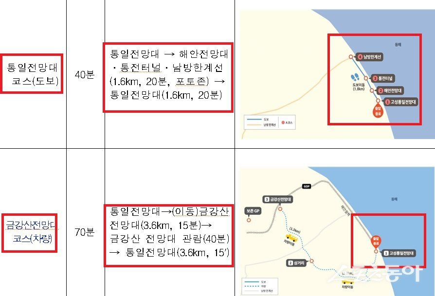 고성군의 DMZ 평화의 길은 A코스(통일전망대)와 B코스(금강산전망대) 두 구간으로 구성돼 있다. 이 중 A코스는 지난 4월 29일부터 운영을 시작했다. B코스는 올해 처음으로 운영이 재개되는 구간이다.