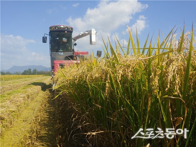 부산 쌀 특화 품종으로 육성 중인 ‘황금예찬’ 수확 모습. (사진제공=부산시 농업기술센터)