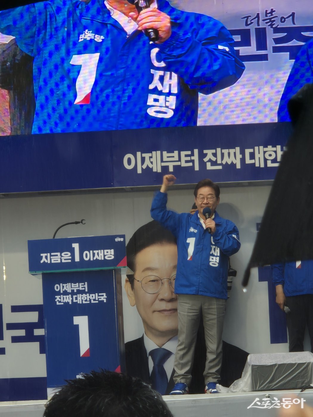 이재명 더불어민주당 제21대 대통령 선거 후보가 15일 순천시를 방문해 선거 유세를 하고 있다. 사진제공=박성화 기자