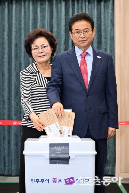 이철우 경북도지사 내외분이 제21대 대통령선거 사전투표를 하고 있다. 사진제공 ㅣ 경북도