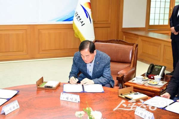 배낙호 시장이 28일 관학 협력 우수사례 확산 홍보를 위한업무협약을 체결하고 있는 모습. 사진제공|김천시