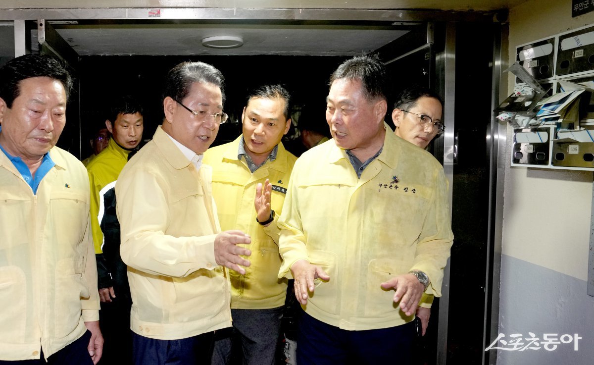 김영록 전남도지사가 지난 3일 저녁 1시간 동안 극한호우가 쏟아진 무안군 무안읍보건소 등 주변 가구 침수 피해 현장을 방문해 신속한 복구 대책을 당부하고 있다. 사진제공=전남도