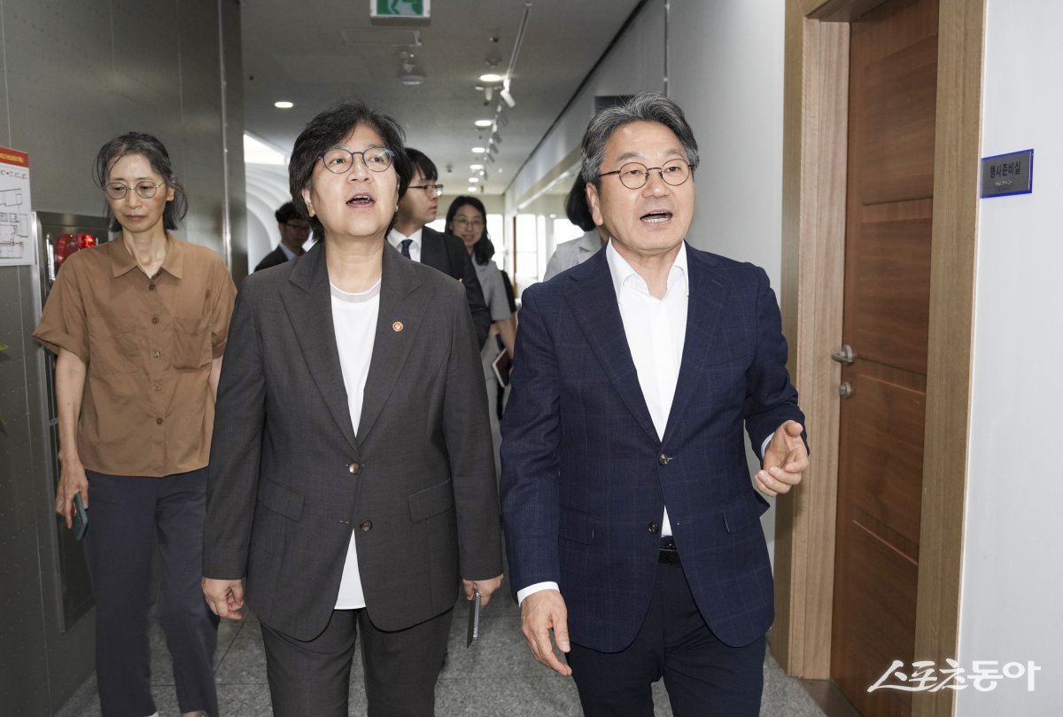 강기정 광주광역시장이 6일 오후 광주시 통합돌봄 정책 현장간담회 참석을 위해 광주광역시청을 방문한 정은경 보건복지부 장관을 맞이하고 있다. 사진제공=광주광역시