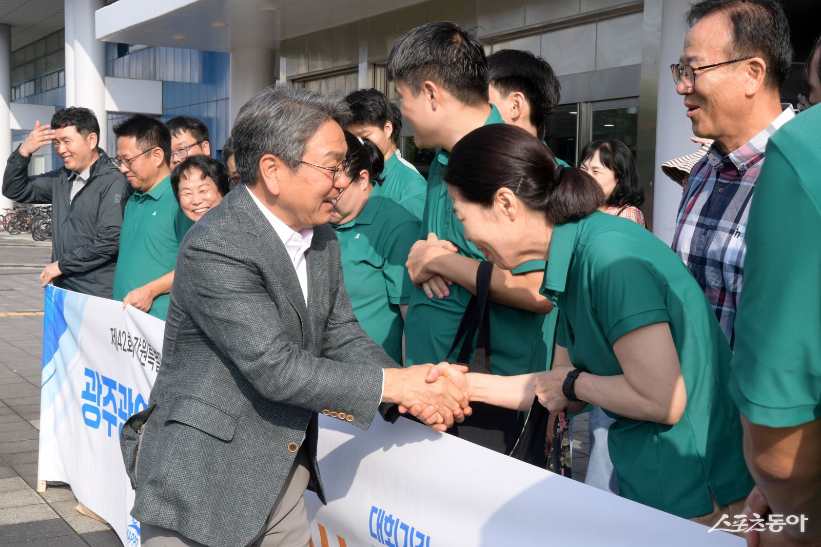 강기정 광주광역시장이 16일 오전 시청 행정동 앞에서 열린 제42회 전국장애인기능경기대회 선수단 출정식에 참석해 선수단을 격려하고 응원했다.