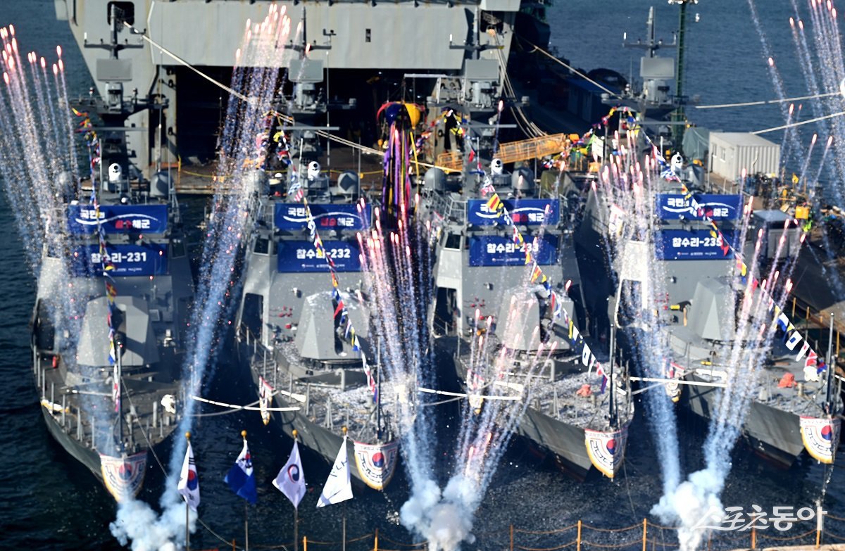 HJ중공업이 지난 8일 해군의 연안방어 전력인 국산 신형고속정 4척의 통합진수식을 가졌다고 밝혔다. 해당 고속정은 HJ중공업이 지난 2022년 해군의 신형 고속정(PKX-B Batch-II) 확보 사업에 따라 건조한 첫 4척이다.