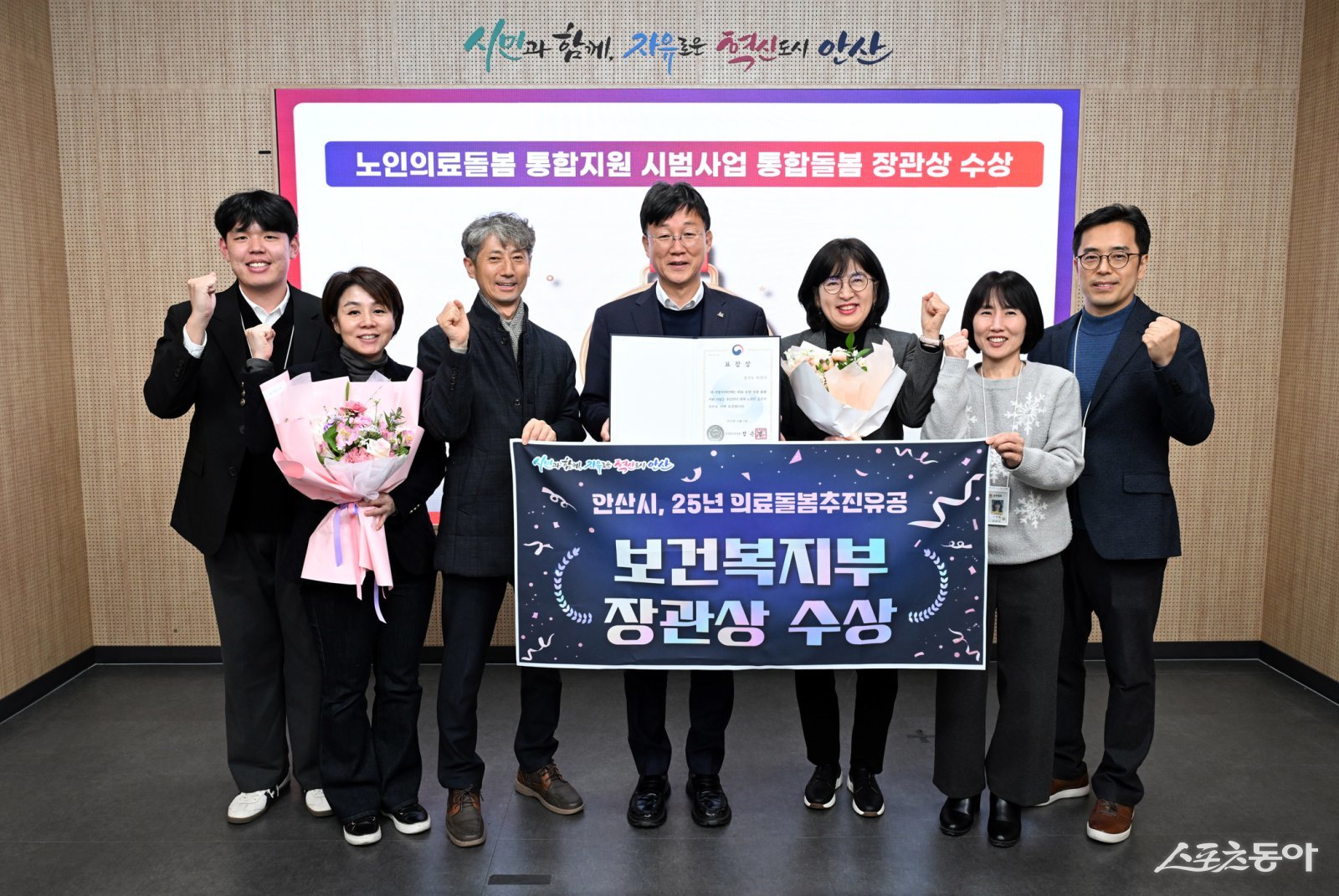 안산시(시장 이민근)는 ‘2025년 의료·돌봄 통합지원 성과대회’에서 의료·돌봄 통합지원사업 추진 유공 지자체로 선정돼 보건복지부 장관상을 수상했다(가운데 이민근 시장). 사진제공|안산시
